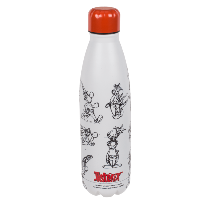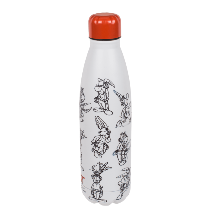 Die 500ml fassende Flasche ist mit Konzeptzeichnungen des berühmten Comic-Galliers auf matt-weißem Hintergrund bedruckt. Zusammen mit dem roten Deckel und dem roten “Asterix”-Schriftzug am unteren Rand der Flasche, ergibt dies eine coole, moderne Optik.