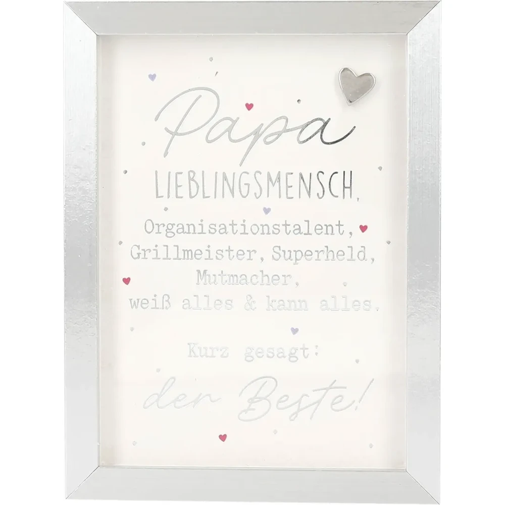 Insgesamt ist der Mini-Bilderrahmen mit Schriftzug “Papa Lieblingsmensch” weit mehr als nur ein dekoratives Element – er ist ein Symbol für Liebe, Dankbarkeit, Wertschätzung und Glück. Verleihen Sie Ihren Botschaften eine besondere Bedeutung – mit diesem kleinen, aber wirkungsvollen Geschenk.