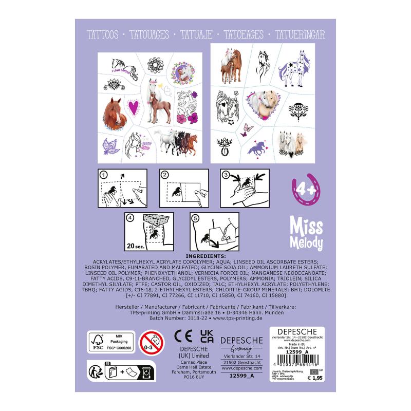 Entdecken Sie die faszinierende Welt von Miss Melody mit den exklusiven Miss Melody Tattoos! Diese zauberhaften Klebe-Tattoos sind ein absolutes Muss für alle Pferde-Freunde, die von der ponytastischen Welt von Miss Melody träumen. Mit zwei Tattoo-Bögen, gefüllt mit wunderschönen Motiven, bringen wir den Zauber dieser fabelhaften Welt direkt auf Ihre Haut.