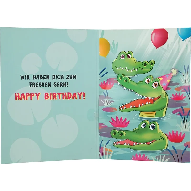 Öffnen Sie die Karte, und der Spaß beginnt! Im Inneren wiederholt sich das Motiv, doch jetzt ist das mittlere Krokodil festlich geschmückt – mit buntem Hütchen und Luftballons im Hintergrund. Doch das Highlight: Das Maul des Krokodils beginnt sich zu bewegen und er spricht, während eine exotische, fröhliche Musik spielt. Ein echter Überraschungsmoment, der zum Lachen einlädt! Links im Inneren steht liebevoll der Spruch: „Wir haben dich zum Fressen gern! Happy Birthday!“