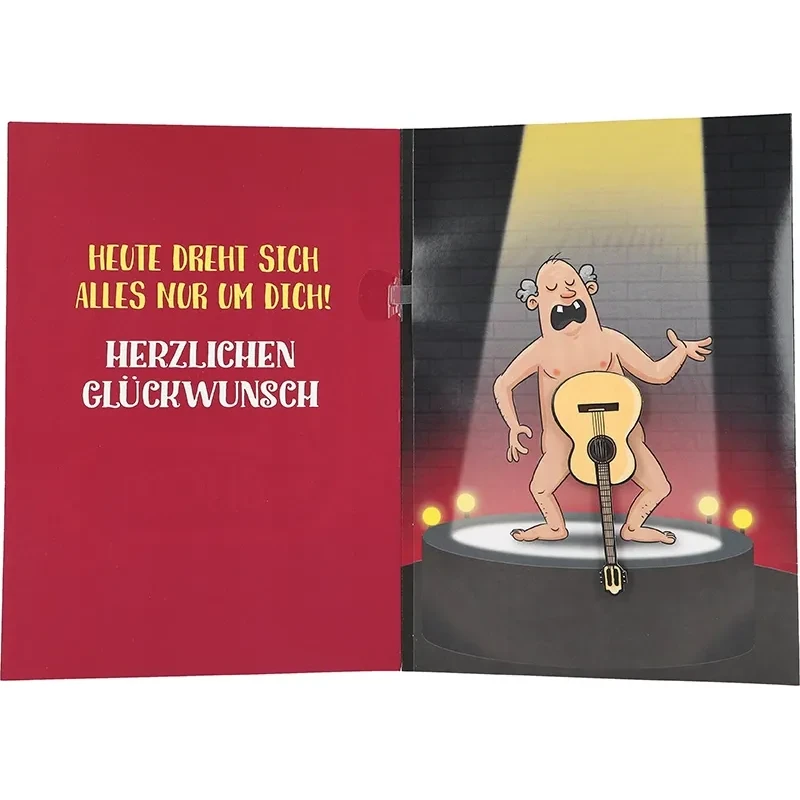 Im Inneren der Karte wird es spektakulär: Eine beleuchtete Bühne erstrahlt auf der rechten Seite. Darauf steht ein nackter älterer Herr mit einem ziemlich schmerzverzerrten Gesichtsausdruck. Das Besondere? Eine Gitarre, die offenbar in einer ganz eigenen Position an ihm „hängt“. Doch es bleibt nicht bei diesem skurrilen Anblick: Beim Öffnen ertönt eine heitere Musik, und die Gitarre beginnt sich im Kreis zu drehen. Eine Szene, die garantiert für Gelächter sorgt! Auf der linken Seite liest man: „Heute dreht sich alles nur um dich! Herzlichen Glückwunsch“ – ein liebevoller Kontrast zur frechen Darstellung auf der Bühne.