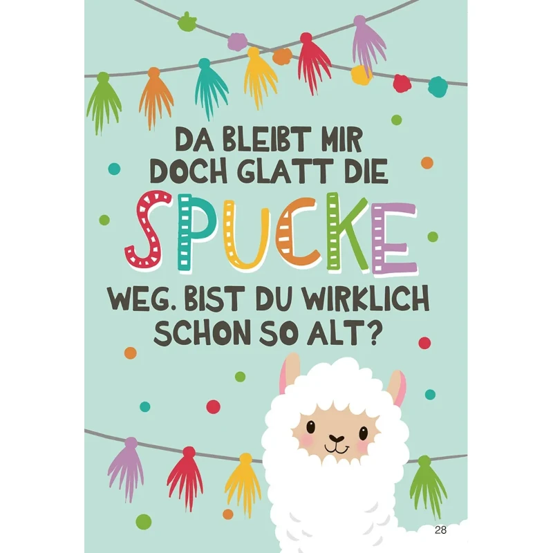 Die Vorderseite ist ein echter Blickfang. Ein hellgrüner Hintergrund, farbenfrohes Konfetti, bunte Girlanden – und am unteren Rand ein süßes, weißes Lama. Mittendrin prangt der humorvolle Spruch: „Da bleibt mir doch glatt die Spucke weg. Bist du wirklich schon so alt?“ – ein liebevoll neckender Einstieg, der garantiert ein Schmunzeln auslöst.