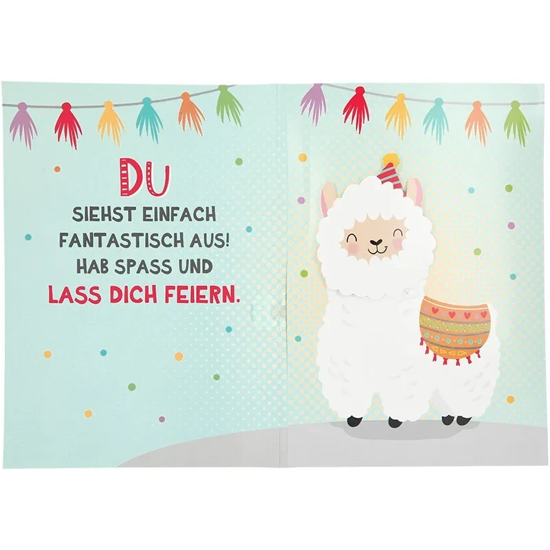 Im Inneren wartet die Überraschung. Das Lama erscheint nun in voller Größe, mit Hütchen und bunter Decke – bereit zur Party. Beim Öffnen erklingt eine fröhliche Melodie, und das Lama wippt lustig mit dem Kopf im Takt. Auf der rechten Seite steht der passende Glückwunsch: „Du siehst einfach fantastisch aus! Hab Spaß und lass dich feiern.“ So macht Gratulieren richtig Freude!
