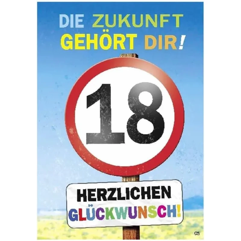 Schon die Vorderseite versprüht Optimismus und Energie: Vor einem strahlend blauen Himmel prangt ein großes Verkehrsschild mit der Zahl „18“. Dazu steht in bunter, verspielter Schrift: „Die Zukunft gehört dir! Herzlichen Glückwunsch!“. Ein modernes, frisches Design, das sofort gute Laune macht und perfekt zum Anlass passt.