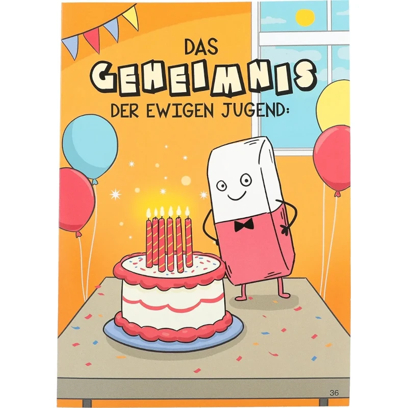 Auf der Vorderseite dieser originellen Klappkarte blicken Sie in ein farbenfroh geschmücktes Geburtstagszimmer. Im Mittelpunkt: eine wunderschön verzierte Geburtstagstorte. Doch das wahre Highlight steht daneben – ein frecher Radiergummi mit schelmischem Grinsen. Über ihm steht der Spruch: „Das Geheimnis der ewigen Jugend:“ – was verbirgt sich wohl dahinter?