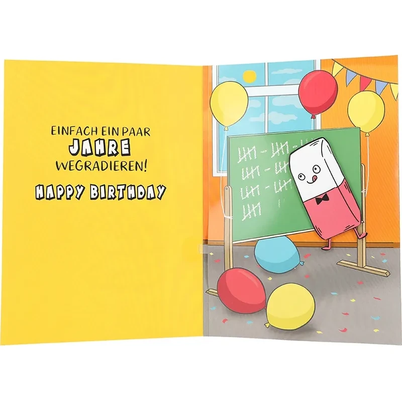 Beim Öffnen der Karte lüftet sich das Geheimnis auf charmante Weise: Im Inneren erscheint eine grüne Tafel mit vielen Zeitmarkierungen. Der Radiergummi wird plötzlich aktiv! Er beginnt, im Takt fröhlicher Musik die Zahlen auf der Tafel wegzuradieren – Jahr für Jahr verschwindet einfach. Daneben steht die liebevolle Fortsetzung des Spruchs: „Einfach ein paar Jahre wegradieren! Happy Birthday.“