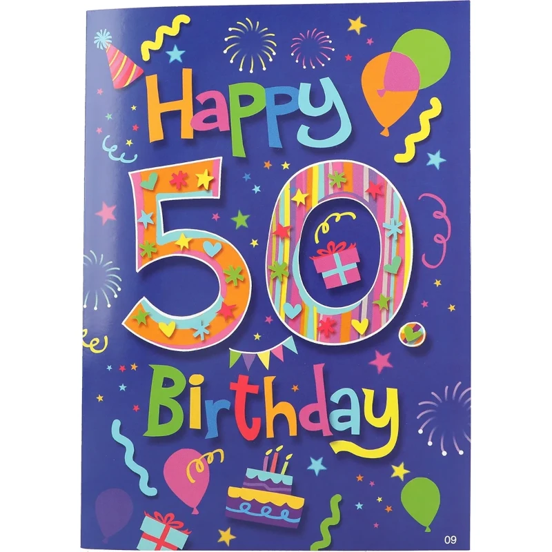 Schon die Vorderseite bringt Vorfreude: Der dunkellila Hintergrund wird von bunten Geburtstagsmotiven belebt. In der Mitte steht in fröhlichen Farben der Schriftzug „Happy 50 Birthday“. Die Zahl „50“ ist besonders groß gestaltet – damit wirklich niemand diesen besonderen Anlass übersieht.