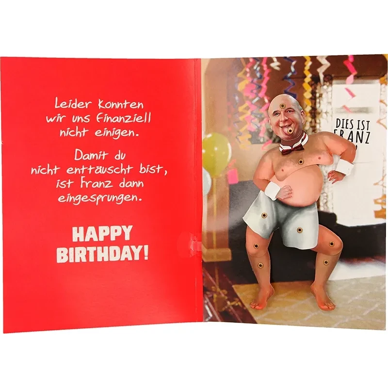 Doch beim Öffnen folgt der unerwartete, urkomische Twist: Links steht die augenzwinkernde Auflösung: „Leider konnten wir uns finanziell nicht einigen. Damit du nicht enttäuscht bist, ist Franz dann eingesprungen. Happy Birthday!“