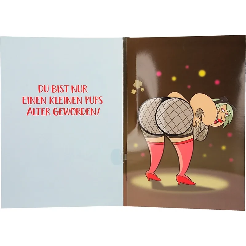 Im Inneren der Karte entfaltet sich eine bunte Szenerie: Eine beleuchtete Bühne schafft den perfekten Rahmen für den großen Auftritt. Auf der rechten Seite steht „die Stripperin“ nun auf der Bühne, nach vorne gebeugt, mit ihrem Hintern prominent im Mittelpunkt. Doch erst beim Öffnen wird’s richtig lustig – der Po beginnt rhythmisch zu wackeln, während laute Pupsgeräusche und fröhliche Musik erklingen. Auf der linken Seite steht mit einem Augenzwinkern: „Du bist nur einen kleinen Pups älter geworden!“
