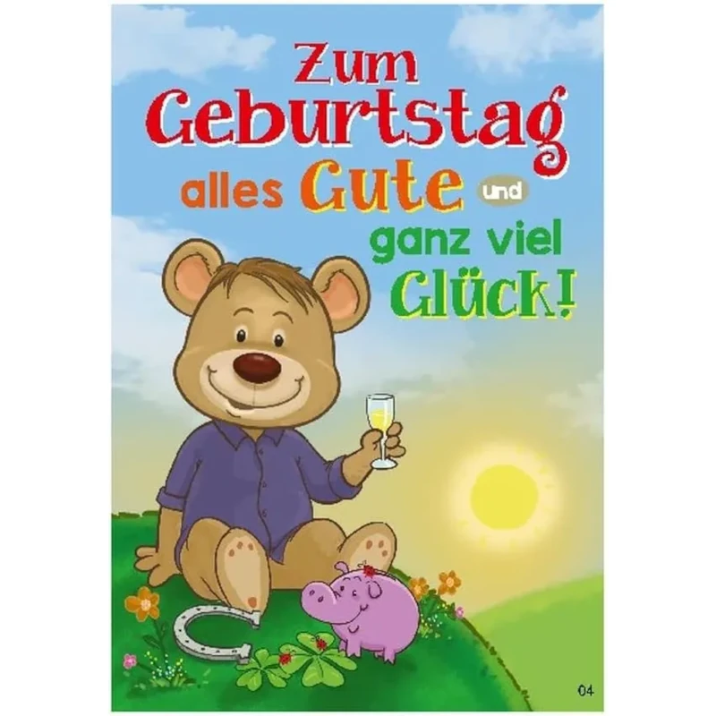 Bereits die Vorderseite zaubert ein Lächeln ins Gesicht: Vor einer sonnigen Landschaft grüßt ein fröhlicher Bär mit Weinglas. Umgeben von einem Sparschwein, einem Hufeisen, Blumen, Marienkäfern und Kleeblättern strahlt er pure Geburtstagsfreude aus. Der leuchtende Schriftzug in Rot, Orange und Grün lautet: „Zum Geburtstag alles Gute und ganz viel Glück!“.