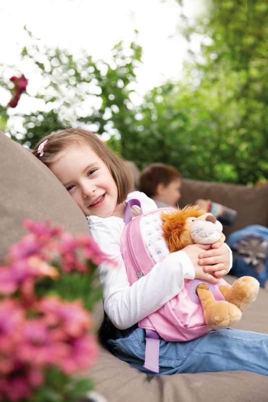 Das Highlight des Rucksacks ist der süße Löwe aus flauschig weichem NICI-Plüsch, der in einer separat befestigten Sitztasche mit Gummizug fixiert ist. Der 25 cm große Löwe schaut sich die Welt vom Rücken des Kindes aus an und kann kinderleicht herausgenommen werden, um zum Schmusen, Spielen und Liebhaben bereit zu stehen. So haben Kinder ihren besten Freund immer dabei, egal wohin es geht.