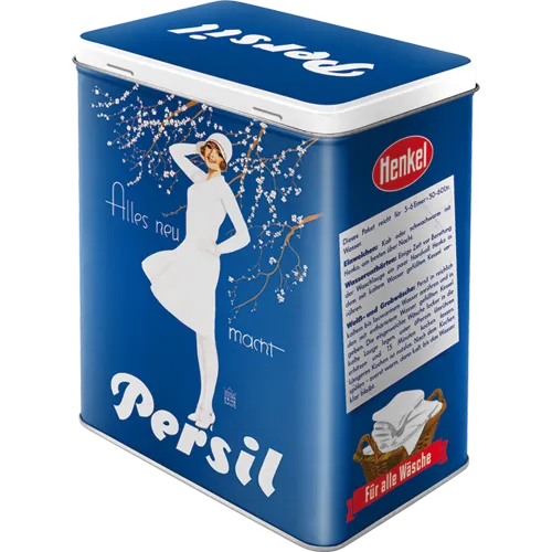 Diese Blechdose ist Teil einer Kollektion, die die Geschichte und den Wiedererkennungswert großer deutscher Traditionsmarken wie Persil, Miele und Dr. Oetker feiert. Persil, bekannt für Zuverlässigkeit und Qualität, hat mit seiner berühmten “Weißen Dame” ein ikonisches Werbesymbol geschaffen, das weltweit für Sauberkeit und Frische steht. Mit dieser Dose holen Sie sich ein Stück dieser erfolgreichen Markengeschichte ins Haus.