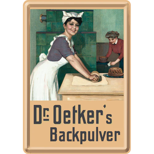 Im Mittelpunkt der Blechpostkarte steht ein ikonisches, historisches Werbemotiv für Dr. Oetkers Backpulver. Das Bild zeigt eine lächelnde Frau in klassischer Küchenschürze und Haube, die an einem Holztisch Teig ausrollt. Während im Hintergrund eine weitere Person einen Kuchen aus dem Ofen nimmt. Die Szene strahlt eine warme, häusliche Atmosphäre aus und symbolisiert die einfache und gelingsichere Backfreude, die Dr. Oetker mit seinem Produkt “Backin” seit über einem Jahrhundert verspricht. Das Motiv in seinen satten, nostalgischen Farben ist eine Hommage an die frühen Werbeplakate des Unternehmens.