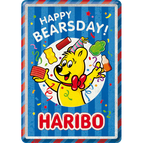 Im Zentrum des farbenfrohen Designs steht der fröhliche HARIBO-Bär in festlicher Stimmung. Er trägt eine Partyhut-Kappe und eine rote Fliege, hält einen Stück Schaumzucker oder Lakritze und eine Gummibeere in den Händen. Um ihn herum wirbeln Konfetti und weitere ikonische HARIBO-Produkte wie der klassische Goldbär, eine Cola-Flasche und ein Frosch. Der Schriftzug “HAPPY BEARSDAY!” prangt in weißen Blockbuchstaben über dem Bären, während das “HARIBO”-Logo prominent am unteren Rand in Rot auf blauem Grund hervorsticht. Das gesamte Design ist von einem lebhaften blau-weiß-gestreiften Muster mit rot-blauen Rändern umrahmt, was dem Schild einen authentischen Retro-Look verleiht. Es ist ein Gute-Laune-Motiv, das sich ideal für Geburtstage, Glückwünsche oder einfach als herzlicher Gruß eignet.