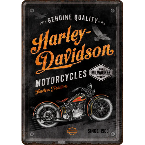 Genau diese zeitlose Faszination fängt die Nostalgic-Art Blechpostkarte “Harley Davidson – Timeless Tradition” in einem kompakten, aber beeindruckenden Format ein. Das Motiv zeigt ein klassisches Harley-Davidson Motorrad, umrahmt von den ikonischen Schriftzügen “Genuine Quality”, “Timeless Tradition” und “Since 1903”. Die dunkle, im Vintage-Stil gehaltene Gestaltung mit dem leuchtenden Orange des Logos und den stilisierten Adlern verleiht der Karte einen authentischen und coolen Look, der direkt an die goldenen Zeiten des Motorradfahrens erinnert.