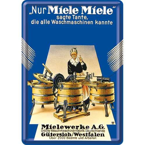 Die Nostalgic-Art Blechpostkarte mit dem historischen Miele-Motiv ist weit mehr als eine gewöhnliche Grußkarte. Sie ist ein hochwertiges Sammlerstück, ein dekorativer Blickfang und ein charmantes Zeugnis deutscher Markentradition. Das abgebildete Motiv zitiert eine der bekanntesten und langlebigsten Werbekampagnen von Miele: „Nur Miele Miele“ sagte Tante, die alle Waschmaschinen kannte.