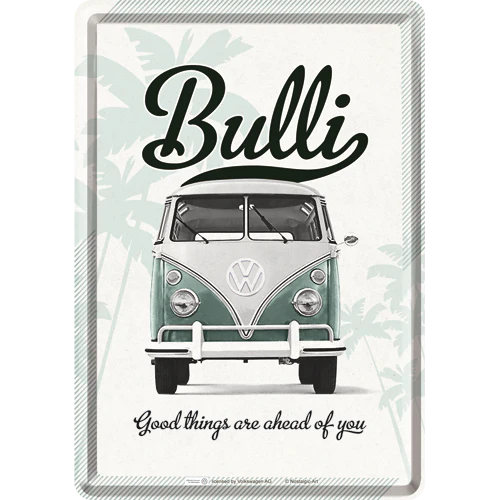 Die Nostalgic-Art Blechpostkarte VW Bulli – Good Things ist ein echtes Highlight für alle Bulli-Fans, Retro-Liebhaber und Sammler nostalgischer Accessoires. Mit ihrem charmanten Motiv eines türkis-weißen VW Bullis und dem inspirierenden Spruch „Good things are ahead of you“ verbreitet sie sofort gute Laune und den unverwechselbaren Spirit von Freiheit, Reisen und Abenteuer.