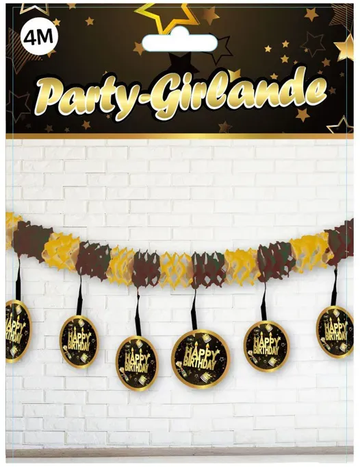 Die Kombination aus Gold und Schwarz verleiht der Party-Girlande einen eleganten, luxuriösen Look. Gleichzeitig bleibt sie modern und zeitlos, sodass sie perfekt zu jedem Geburtstagsmotto passt. Ob für eine große Party oder ein kleines Treffen, die Girlande setzt stilvolle Akzente und sorgt für sofortige Aufmerksamkeit. Die Länge von 4 Metern reicht aus, um den Raum im Handumdrehen zu verwandeln und eine feierliche Atmosphäre zu schaffen. So kannst du deine Location ganz nach deinem Geschmack gestalten.