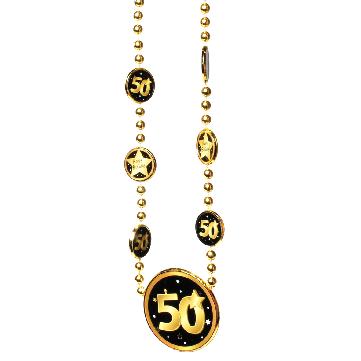 Diese Kette aus Kunststoff in den Farben gold und schwarz ist ein toller Hingucker. Verziert ist diese Kette mit kleinen Schildern auf denen die Zahl “50” gedruckt ist und kleine Schilder mit einem Stern auf dem “Happy Birthday” steht.
