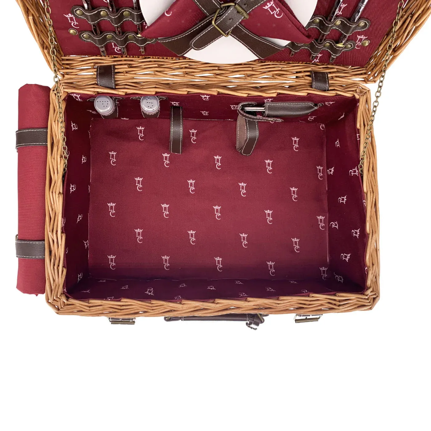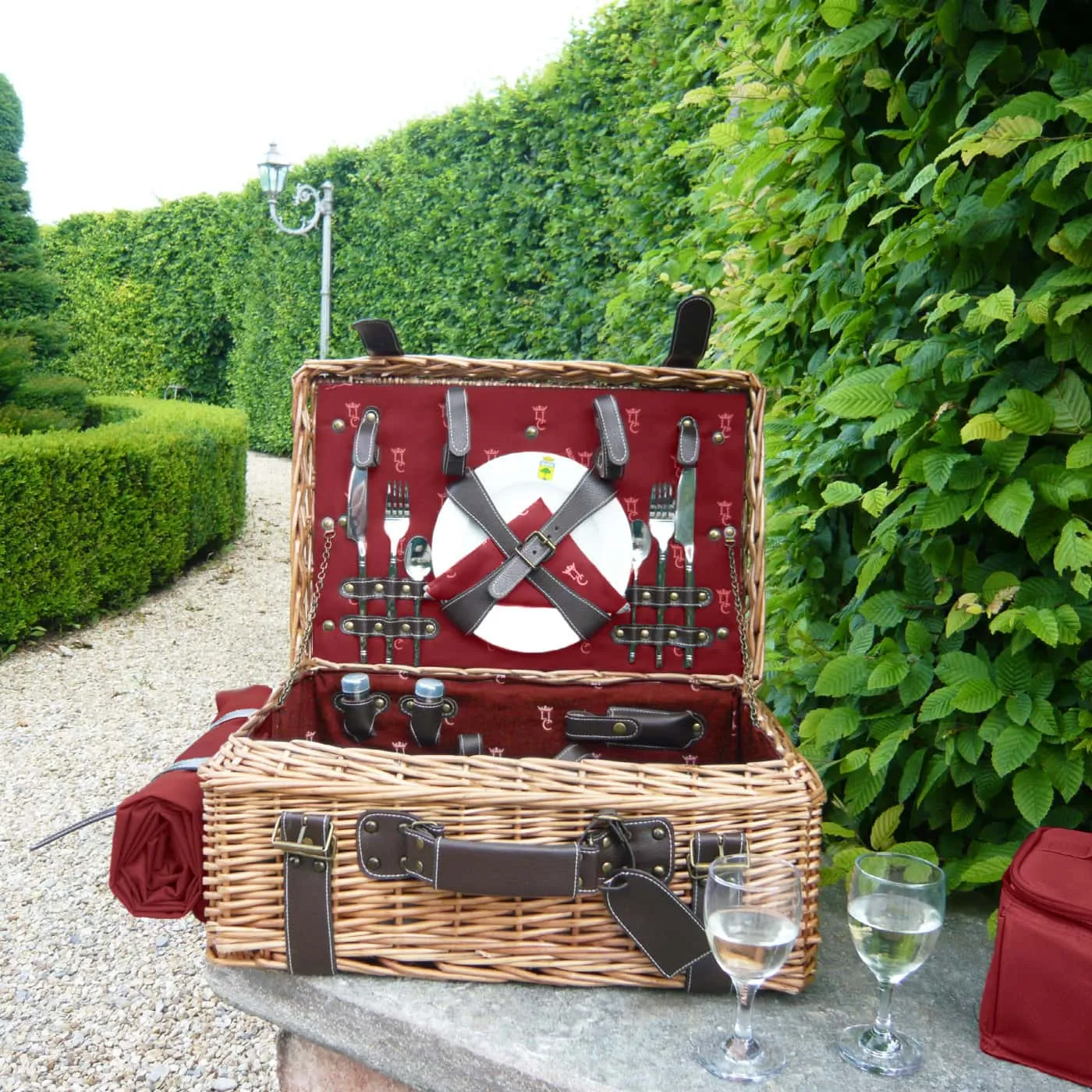 An der Außenseite befinden sich zwei Lederhalterungen zur praktischen Befestigung der beiliegenden Tischdecke. Innen überrascht der Korb mit einem edlen, bordeauxroten Baumwollfutter samt Les Jardins de la Comtesse-Monogramm, das die luxuriöse Anmutung perfekt abrundet.