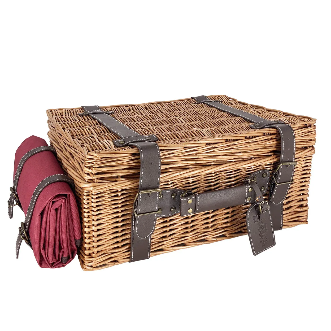 Gefertigt aus fein geflochtener honigfarbener Weide und veredelt mit Details aus echtem, gestepptem Leder, verkörpert dieser Picknickkorb den Inbegriff klassischer Eleganz. Der Korb wird in aufwendiger Handarbeit hergestellt – die Qualität spürt und sieht man. Zwei robuste Lederriemen mit Metallschnallen sorgen für sicheren Verschluss, während der genietete Tragegriff ebenfalls aus Leder besteht und komfortables Transportieren ermöglicht.
