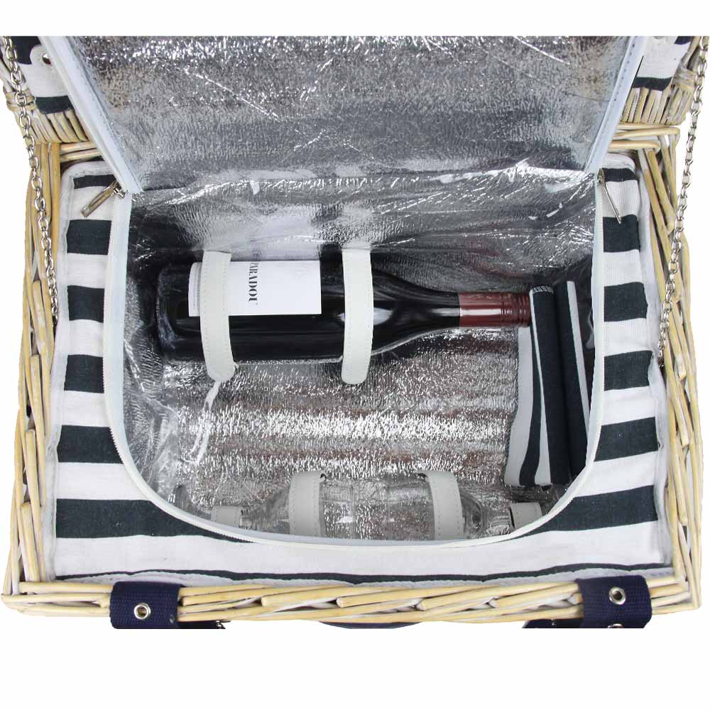 Der Korb selbst ist elegant und komplett aus naturbelassenem Weidengeflecht gefertigt und mit einer eierschalenfarbigen Beschichtung versehen. Im Inneren befindet sich ein blauweiß gestreifter Stoff, der dem Korb eine maritim angehauchte Note verleiht. Der untere Teil besteht aus einem Isolierfach, das ausreichend Platz für Speisen und Getränke bietet und so dafür sorgt, dass diese auch an heißen Tagen lange kühl bleiben.