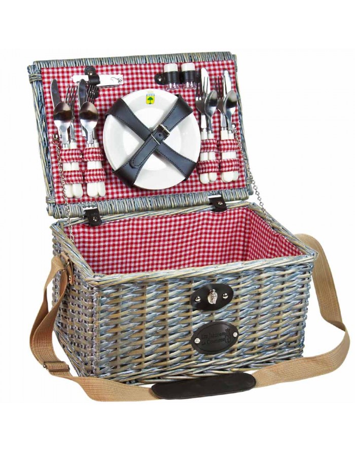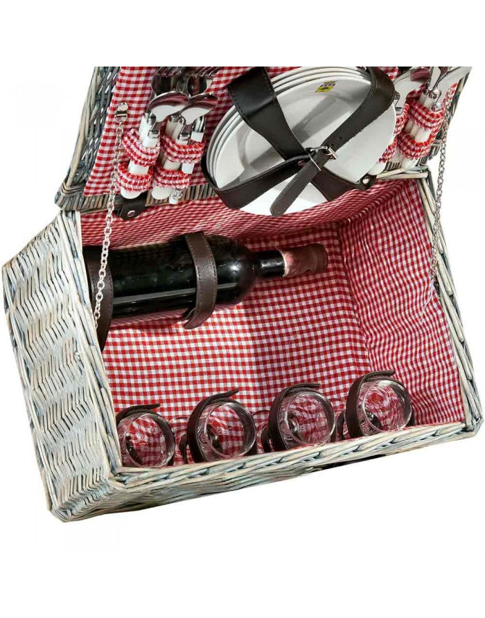 Der “Sully” Picknickkorb ist für 4 Personen konzipiert und enthält alles, was man für ein Picknick benötigt. Es gibt 4 weiße Keramikteller mit einem Durchmesser von 20 cm sowie 4 Weingläser aus Glas (12 cl). Das komplette Besteckset besteht aus Edelstahl und verfügt über weiße Melamingriffe. Zudem sorgt ein Halterring dafür, dass die Getränkeflasche sicher aufbewahrt werden kann.
