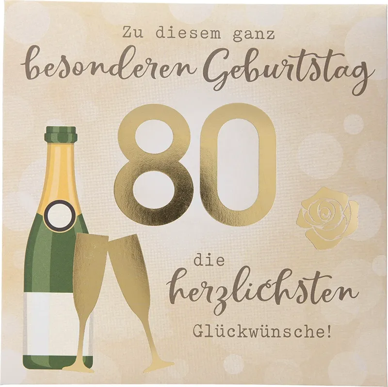 Der elegante champagnerfarbene Hintergrund verleiht der Karte sofort eine festliche Ausstrahlung. In der Mitte glänzt die große, goldene Zahl „80“, umrahmt vom Schriftzug: „Zu diesem ganz besonderen Geburtstag die herzlichsten Glückwünsche!“ Zusätzlich schmücken eine goldene Rose sowie eine stilvolle Sektflasche mit zwei goldenen Gläsern die Vorderseite – ein Zeichen für Dankbarkeit, Lebensfreude und das gemeinsame Anstoßen auf viele schöne Jahre.
