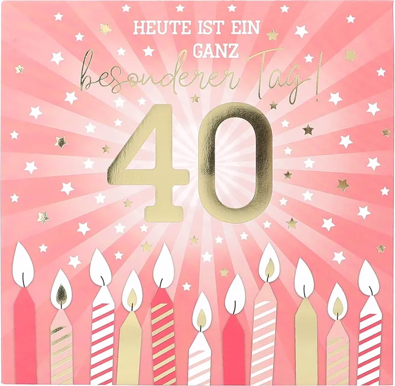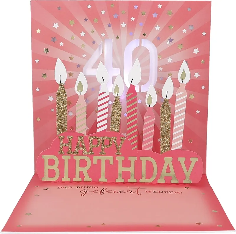 Der strahlende rosa Hintergrund lässt die große, goldene „40“ in der Mitte besonders edel wirken. Weiße und goldene Sterne, liebevoll gezeichnete Geburtstagskerzen am unteren Rand und der goldene Schriftzug „Heute ist ein ganz besonderer Tag!“ verleihen der Karte eine festliche, elegante Ausstrahlung. Beim Öffnen entfaltet sich das Highlight: Ein detailreiches Pop-up mit aufgerichteten Geburtstagskerzen erscheint – begleitet von Lichteffekten und dem fröhlichen Lied „Happy Birthday“. Ein echtes Erlebnis für die Sinne!