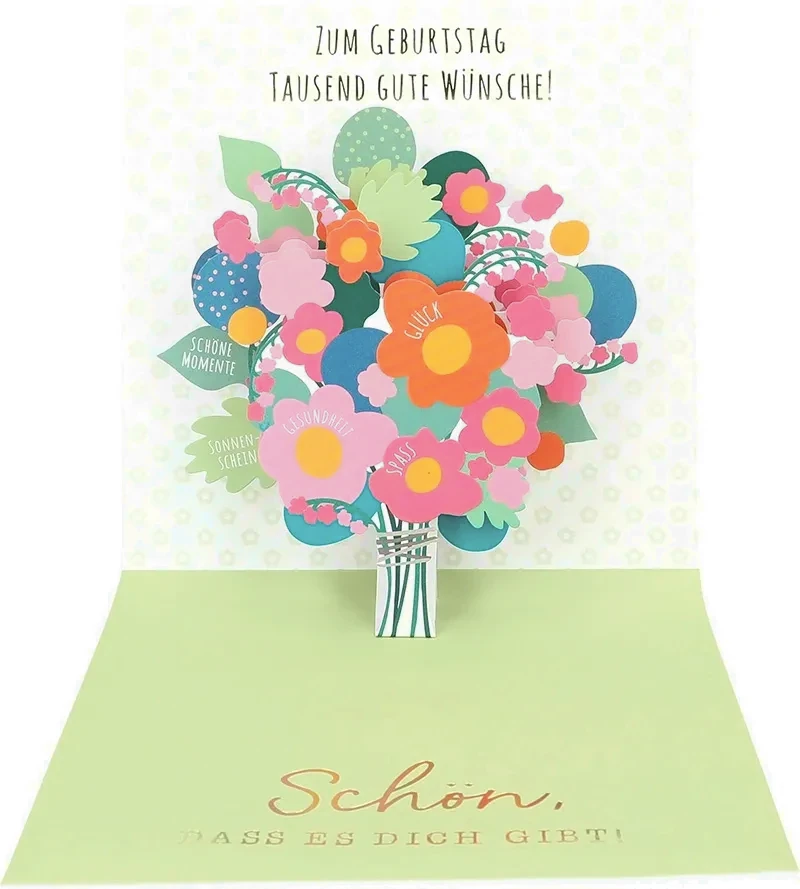 Wählen Sie aus 56 einzigartigen Motiven – doch für Geburtstage ist diese Variante ein echter Favorit. Zeigen Sie Gefühl, Stil und Persönlichkeit – mit der Pop-up-Musikkarte „Blumenstrauß“, die Augen zum Leuchten bringt und Freude hörbar macht.