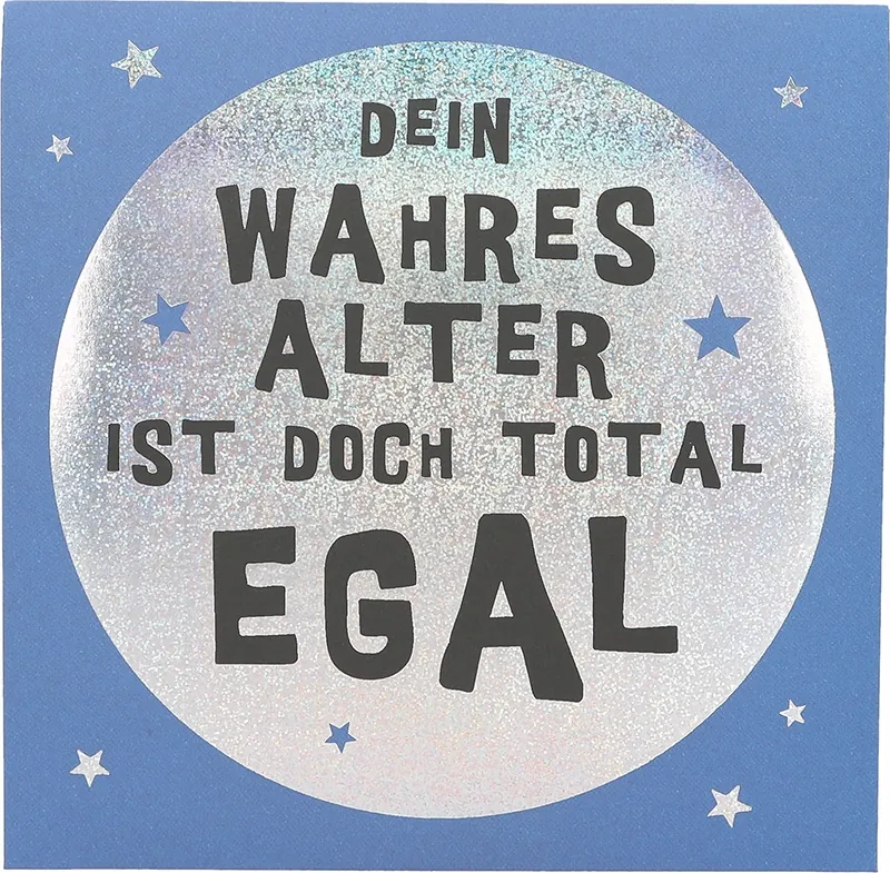 Schon das Cover bringt jeden zum Schmunzeln: Die Vorderseite zeigt in großen, auffälligen Buchstaben den Spruch „Dein wahres Alter ist doch total egal“. Umrahmt wird die Botschaft von funkelnden Sternen auf einem tiefblauen Hintergrund, während die zentrale Fläche in silbernem Glitzereffekt erstrahlt. Diese besondere Gestaltung sorgt dafür, dass die Karte sofort ins Auge fällt und wie ein strahlender Vollmond wirkt – ein Symbol für Lebensfreude, Glanz und das Leuchten, das man unabhängig vom Alter ausstrahlt.