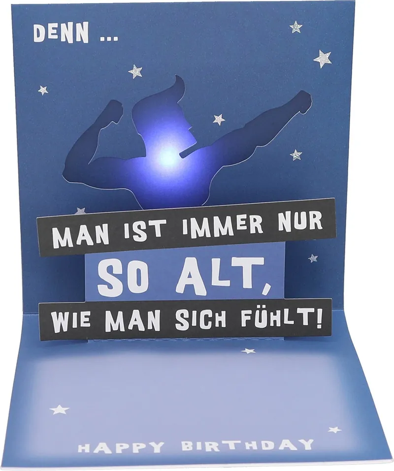 Doch der eigentliche Höhepunkt wartet im Inneren: Beim Öffnen spielt die Karte den weltbekannten Gute-Laune-Song „I Got You (I Feel Good)“. Spätestens wenn die ersten Töne erklingen, ist die Stimmung auf dem Höhepunkt. Die mitreißende Melodie verbreitet pure Energie und passt perfekt zum humorvollen Text auf der Karte – schließlich kommt es nicht darauf an, wie alt man ist, sondern darauf, wie jung man sich fühlt.
