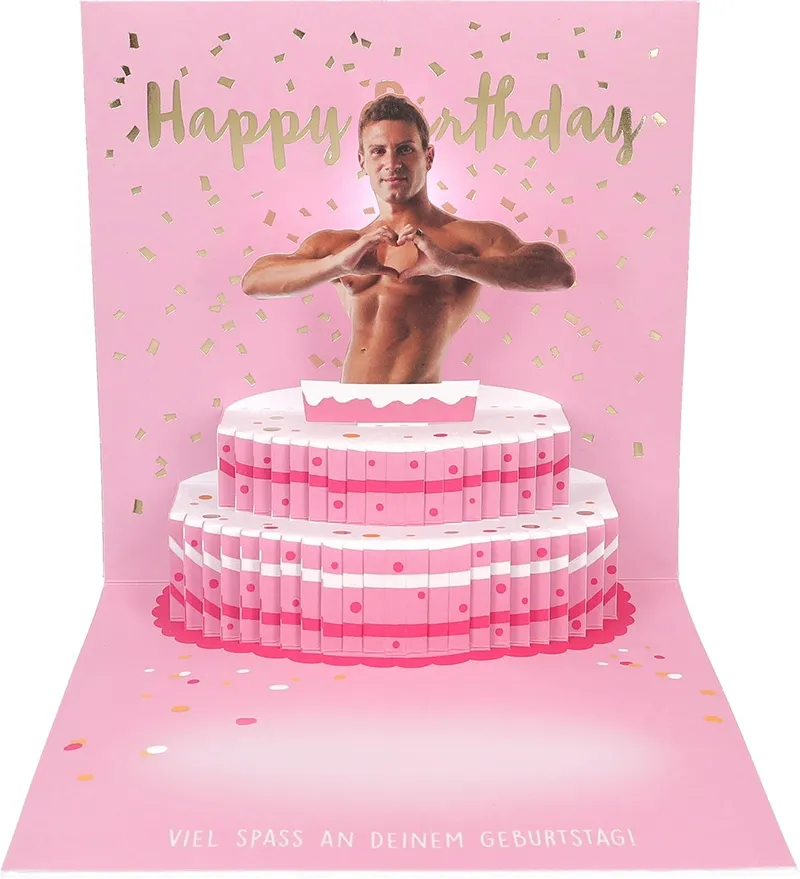 Doch das Beste kommt beim Öffnen: Der Song „Good Time“ erklingt – lebendig, mitreißend, gut gelaunt. Gleichzeitig beginnt ein blinkender Lichteffekt die Szene zum Leben zu erwecken. Und dann – die Überraschung: Aus einer detailreich gestalteten Torte erhebt sich ein muskulöser, attraktiver Mann mit freiem Oberkörper, der mit seinen Händen ein Herz formt. Ein Pop-up-Element, das für Lacher, Staunen und ein breites Grinsen sorgt – garantiert!
