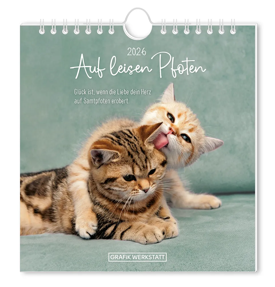 Sie lieben Katzen? Dann wird Ihnen der Postkartenkalender “Auf leisen Pfoten” 2026 das Herz erwärmen. Schon das liebevoll gestaltete Deckblatt mit zwei Kätzchen, die sich zärtlich gegenseitig das Fell pflegen, berührt auf den ersten Blick. Dazu der einfühlsame Spruch: „Glück ist, wenn die Liebe dein Herz auf Samtpfoten erobert“ – und genau das tut dieser Kalender. Tag für Tag. Monat für Monat.