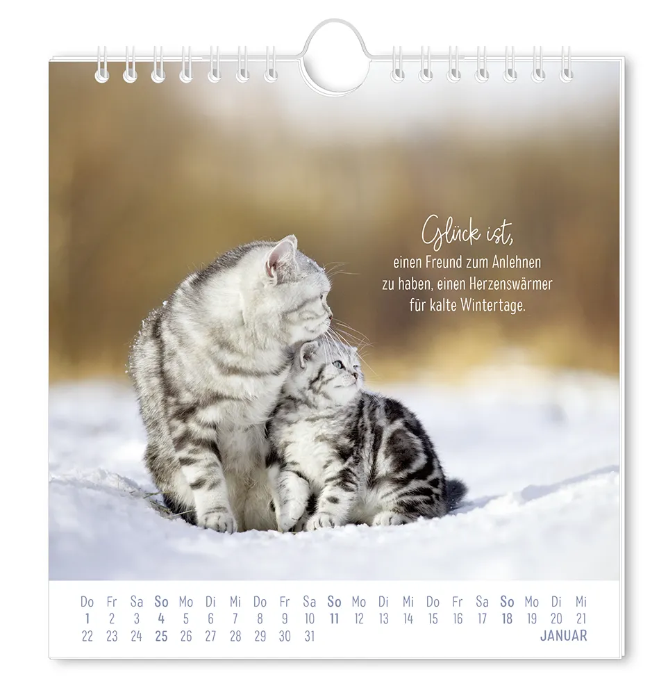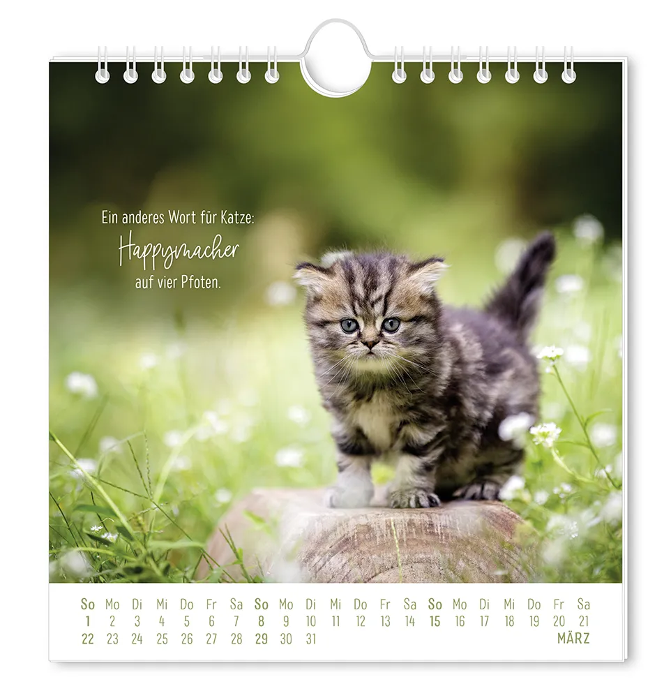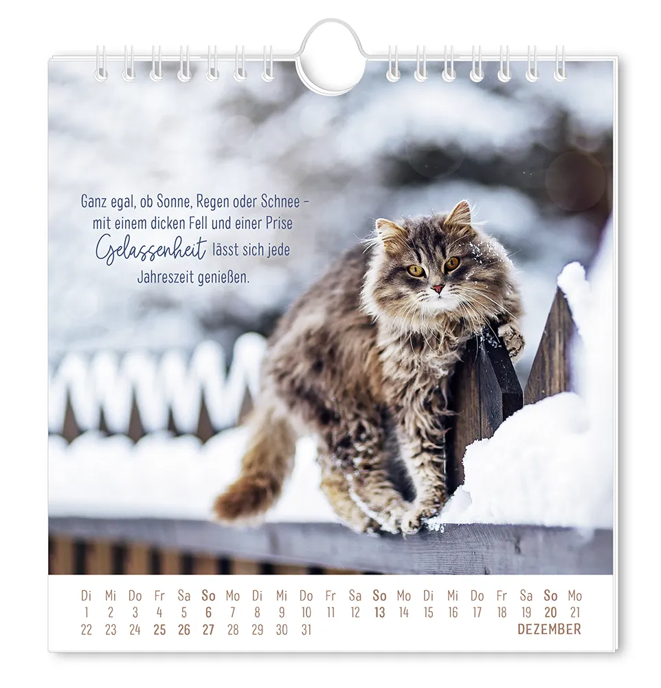 Jede der zwölf Seiten ist individuell gestaltet und zeigt ein hochwertiges, emotionales Katzenfoto – mal verspielt, mal verträumt, mal zum Schmunzeln. Ergänzt wird jedes Motiv durch einen einzigartigen, liebevollen Spruch, der mitten ins Herz trifft. Ob als täglicher Stimmungsaufheller oder als kleine Erinnerung an die stillen, kostbaren Momente im Leben – dieser Kalender begleitet Sie achtsam durch das Jahr.