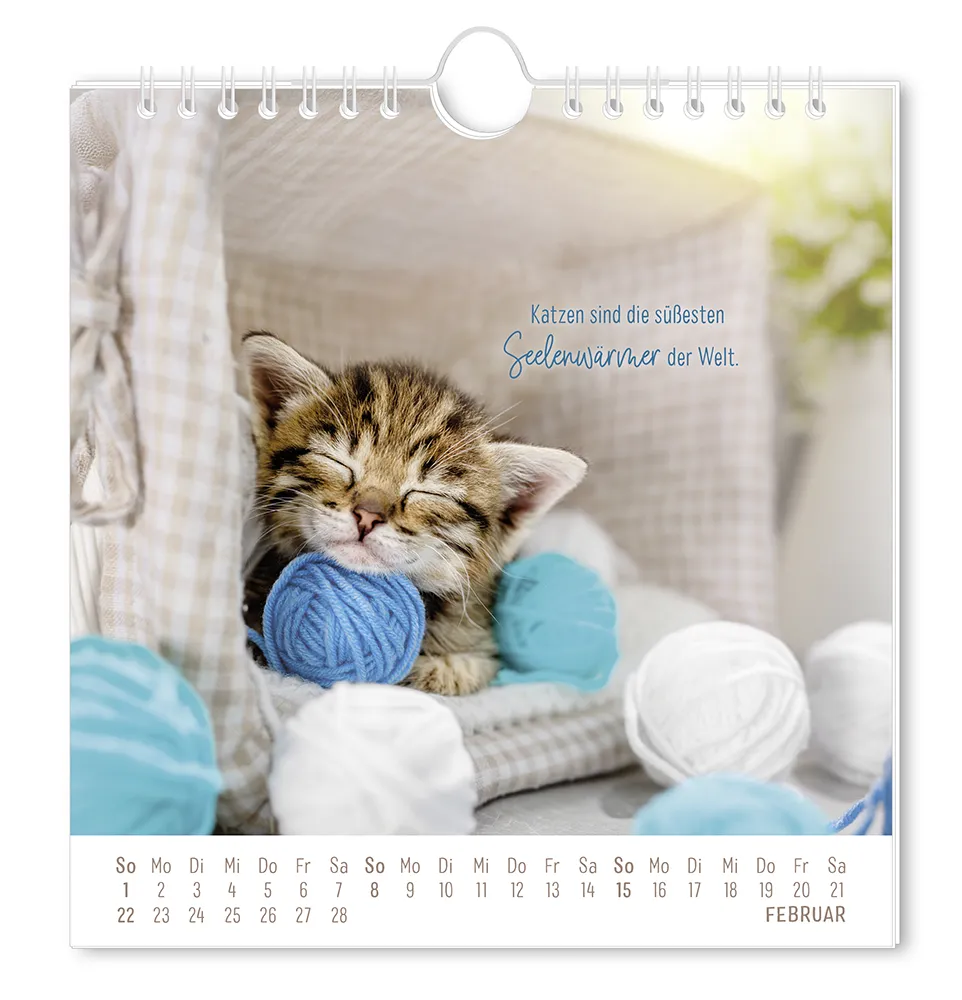 Die stabile Spiralbindung sorgt für bequemes Umblättern, während der mitgelieferte Aufsteller für einen sicheren Stand sorgt. Und weil uns nicht nur Katzen, sondern auch unsere Umwelt am Herzen liegt, besteht der Kalender aus FSC®-zertifiziertem Papier – für ein rundum gutes Gefühl.