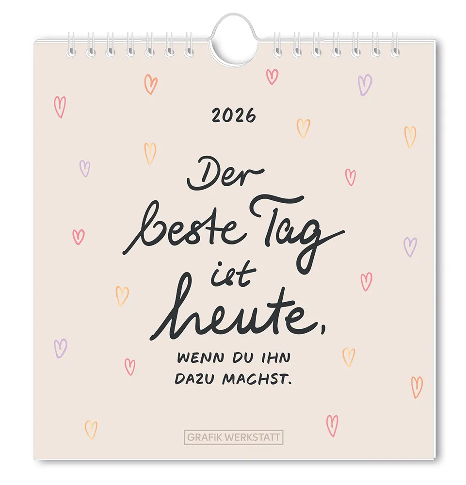 Manchmal braucht es nur einen liebevollen Impuls, um den Tag in einem neuen Licht zu sehen. Der Postkartenkalender “Der beste Tag” 2026 erinnert Sie Tag für Tag daran, dass das Glück im Moment liegt. Nicht irgendwo in der Zukunft, sondern genau jetzt. Schon das zart rosafarbene Deckblatt mit kleinen bunten Herzchen stimmt auf das ein, was dieser Kalender schenkt: Wärme, Zuversicht und ein Lächeln. Der motivierende Schriftzug „Der beste Tag ist heute, wenn du ihn dazu machst“ lädt dazu ein, bewusst und positiv in jeden neuen Tag zu starten.