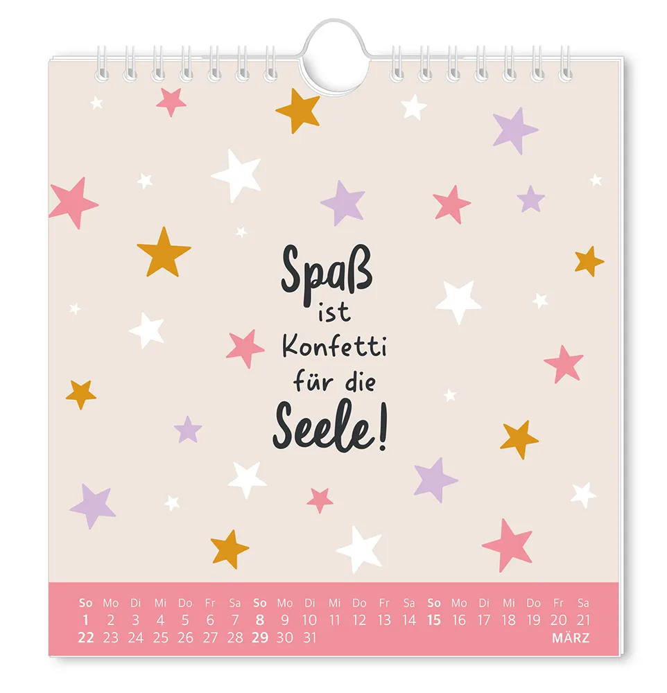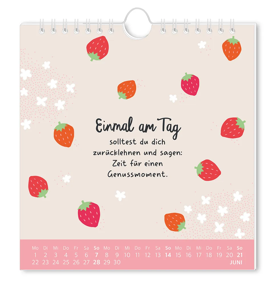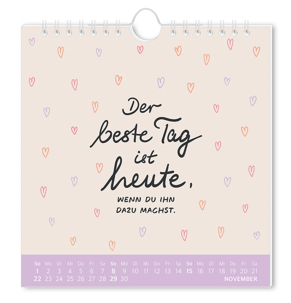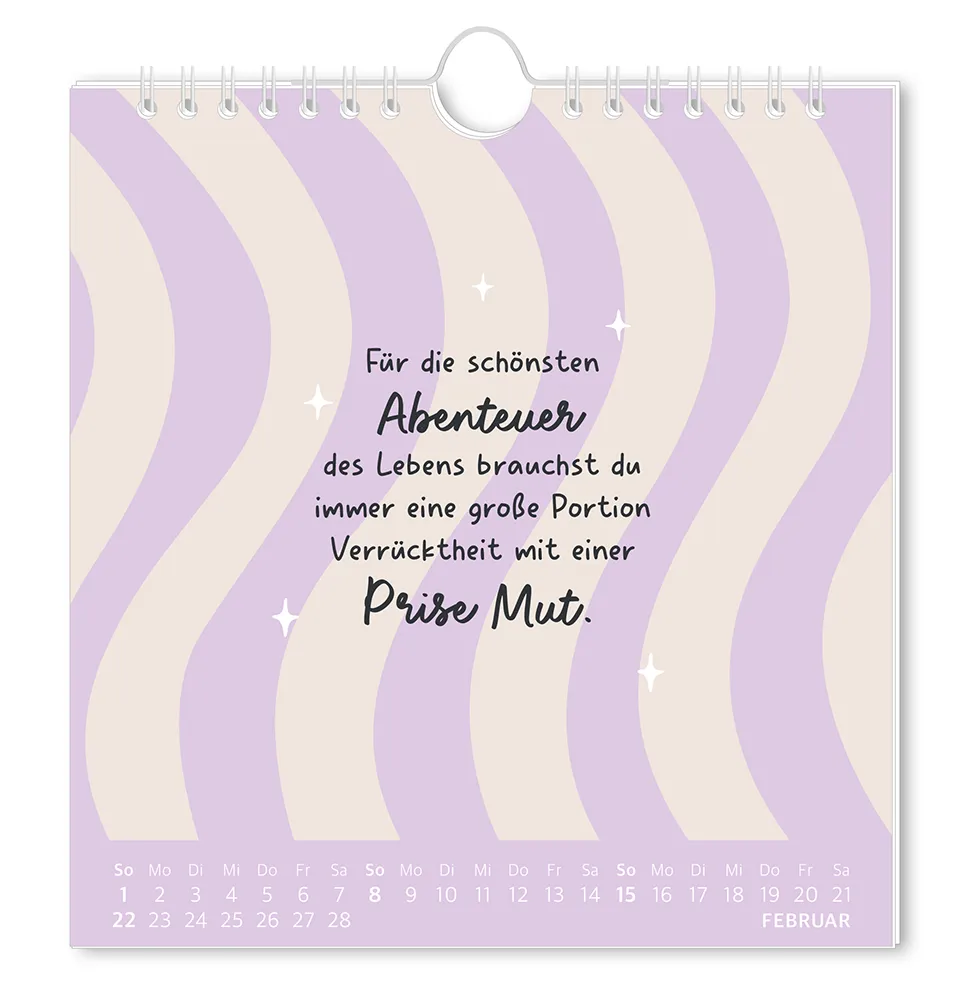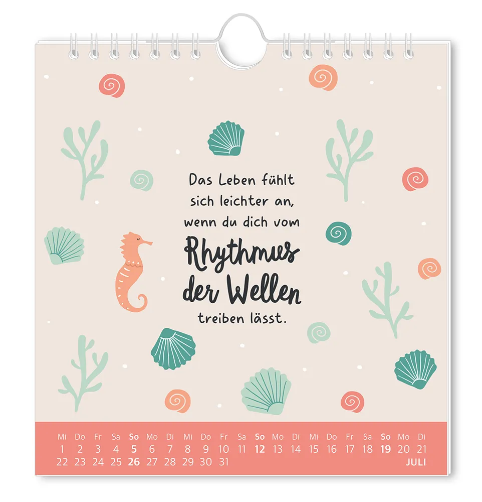 Jeder Monat überrascht mit einer liebevoll gestalteten Seite – sanfte Farben, zarte Muster, harmonische Kompositionen und ein inspirierender Spruch, der die Seele berührt. Ob ermutigend, nachdenklich oder einfach wohltuend – jedes Kalenderblatt schenkt neue Perspektiven. So wird jeder Monat zu einer kleinen Auszeit, zu einem Moment der Selbstfürsorge mitten im Alltag.