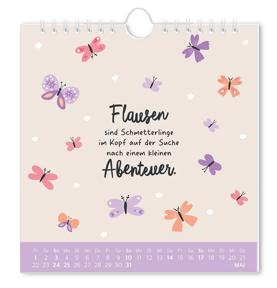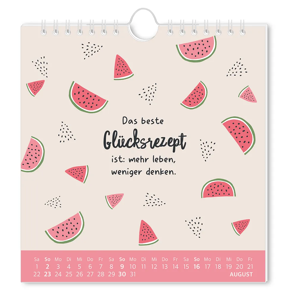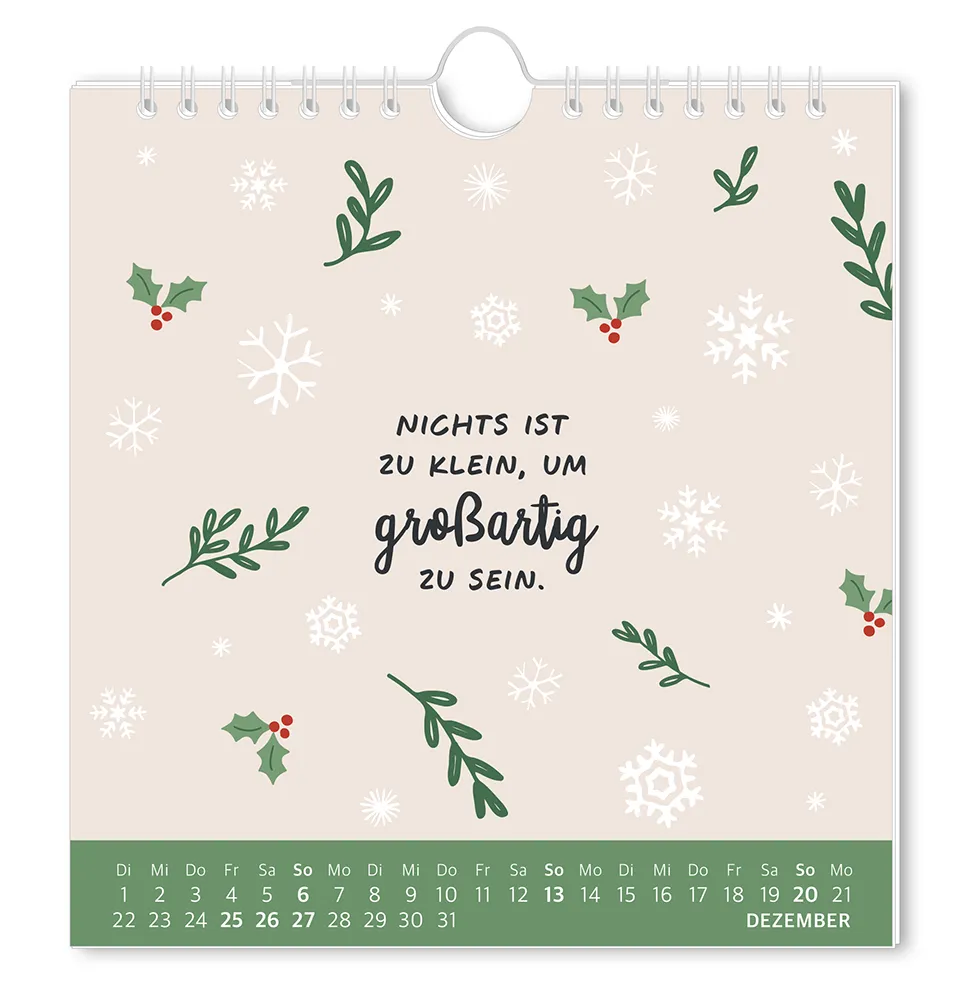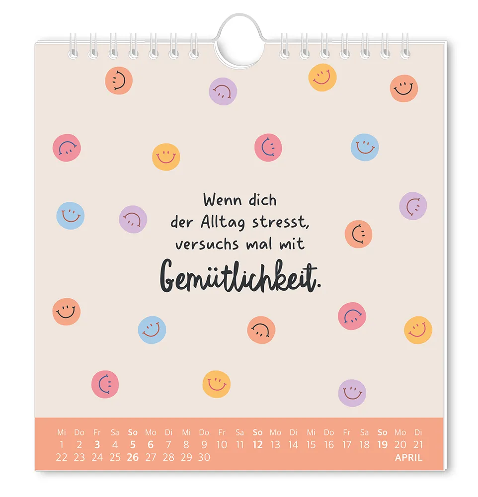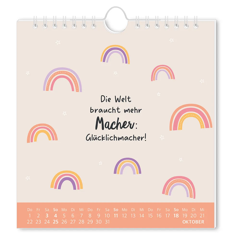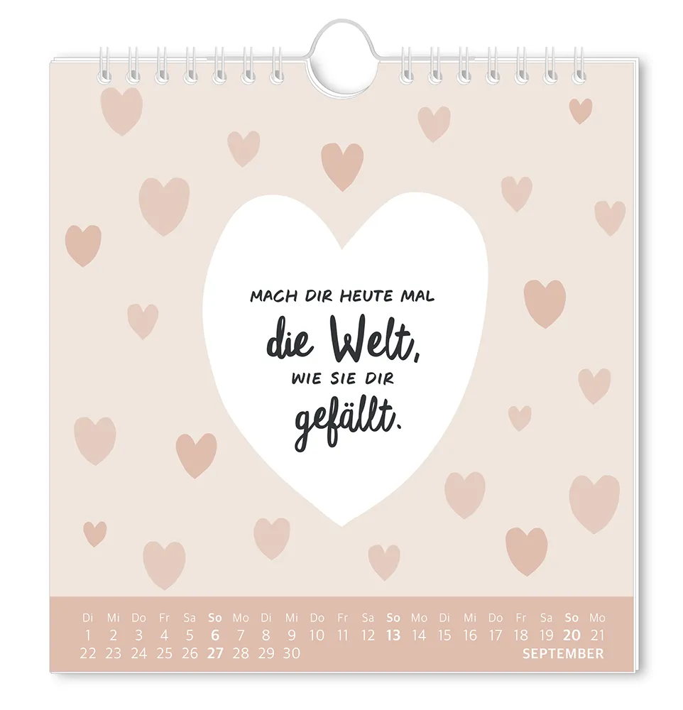 Jeder Monat überrascht mit einer liebevoll gestalteten Seite – sanfte Farben, zarte Muster, harmonische Kompositionen und ein inspirierender Spruch, der die Seele berührt. Ob ermutigend, nachdenklich oder einfach wohltuend – jedes Kalenderblatt schenkt neue Perspektiven. So wird jeder Monat zu einer kleinen Auszeit, zu einem Moment der Selbstfürsorge mitten im Alltag.