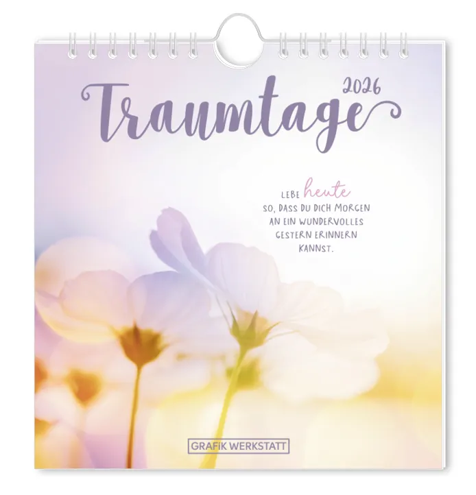 Der Postkartenkalender “Traumtage” 2026 lädt Sie dazu ein, jeden Tag mit einem Lächeln zu beginnen – mit liebevoll ausgewählten Bildern und Zitaten, die zum Träumen, Innehalten und Genießen einladen. Schon das Deckblatt verzaubert: Sanfte Blumen im goldenen Licht des Morgens, begleitet vom berührenden Spruch: „Lebe heute so, dass du dich morgen an ein wundervolles Gestern erinnern kannst.“