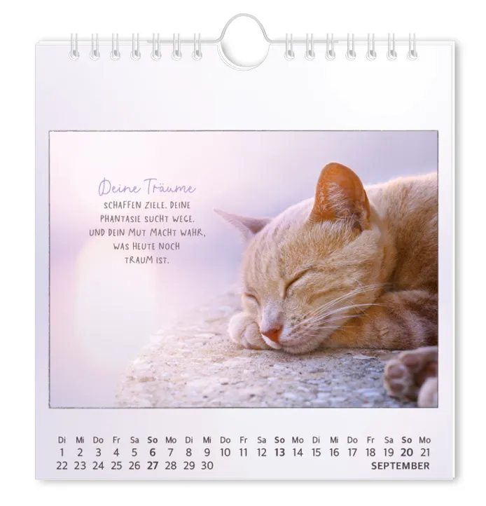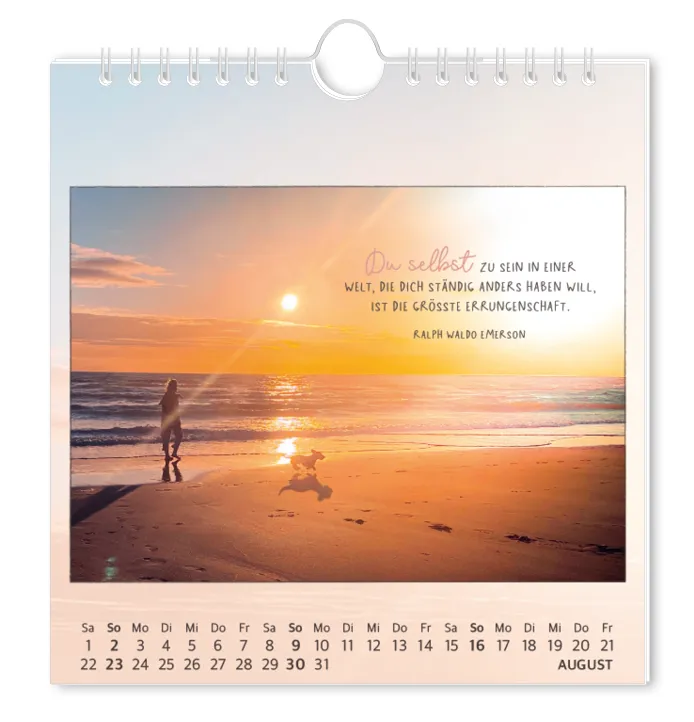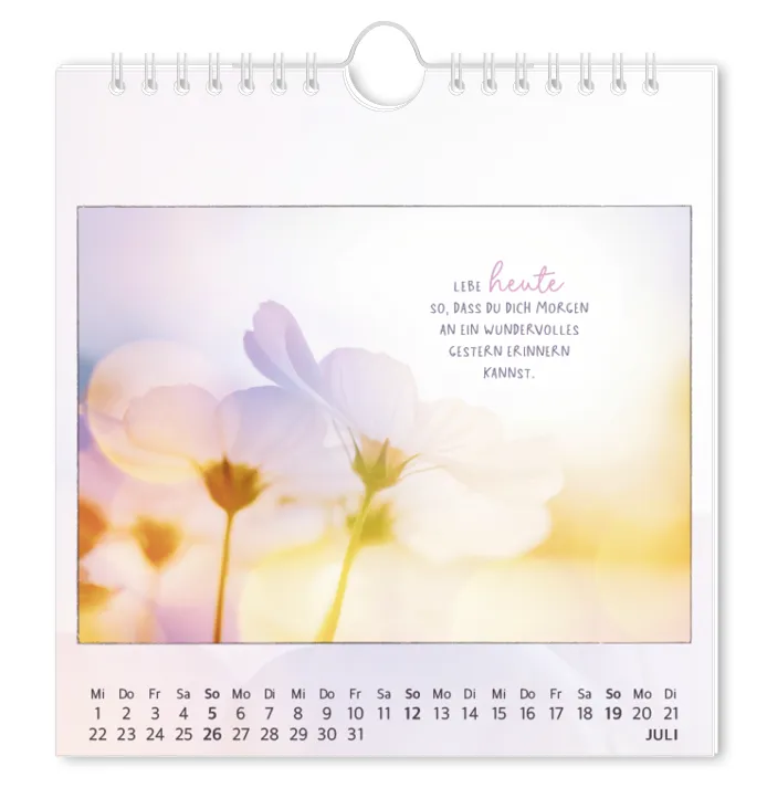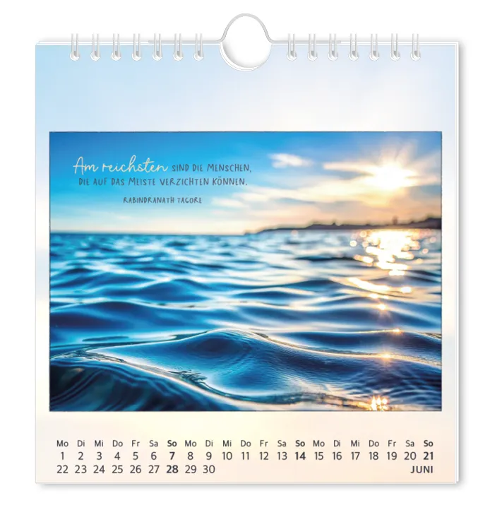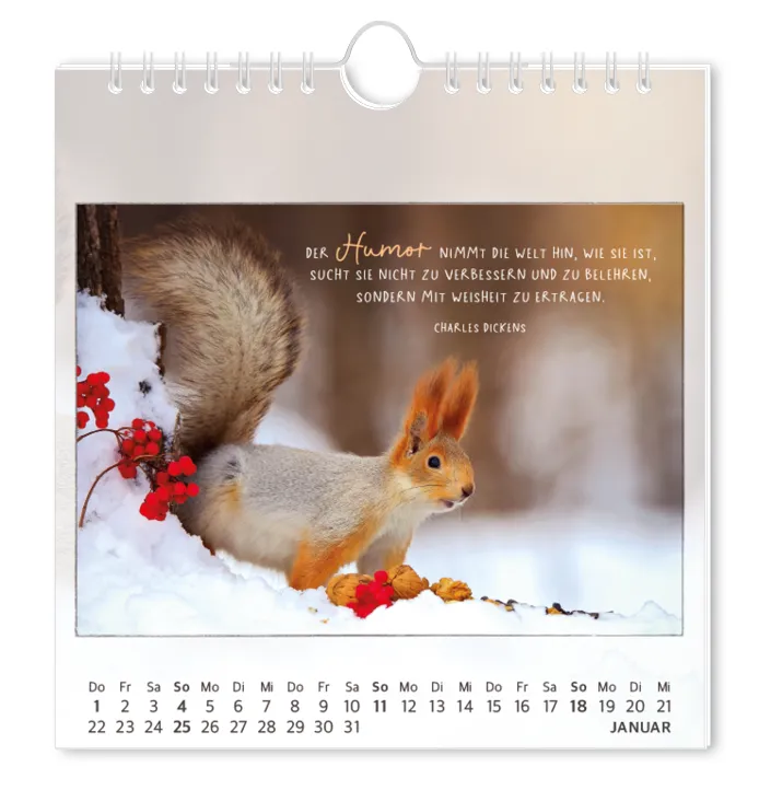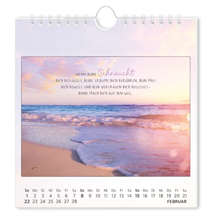 Monat für Monat überrascht dieser Kalender mit einem stimmungsvollen Natur- oder Tierfoto, das zum Verweilen einlädt. Dazu gesellt sich jeweils ein inspirierendes Zitat – mal nachdenklich, mal hoffnungsvoll, mal voller Lebensfreude. So wird jeder Monat zu einem kleinen Geschenk.