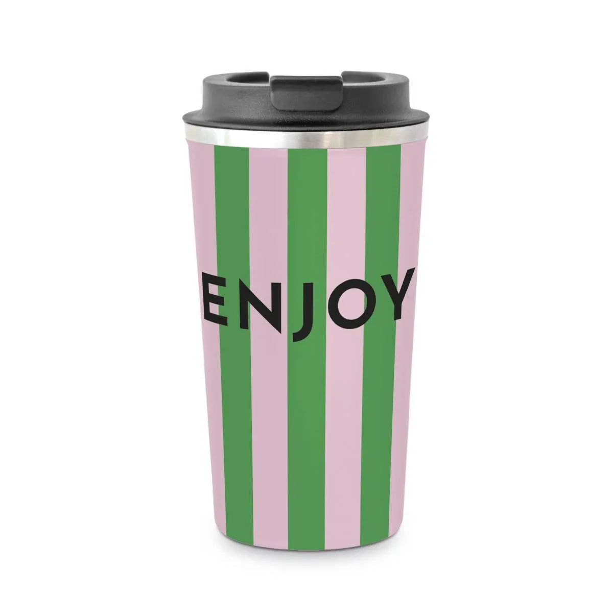 Der Becher überzeugt nicht nur durch Funktion, sondern auch durch seine stilvolle Optik: Das farbenfrohe Streifendesign in Pink und Grün, kombiniert mit dem eleganten schwarzen Schriftzug “Enjoy” und der edelstahlfarbenen Akzentlinie unter dem Deckel, macht ihn zu einem echten Hingucker. Ob als Geschenk oder für den Eigengebrauch – dieses Design spricht an und bringt Freude.
