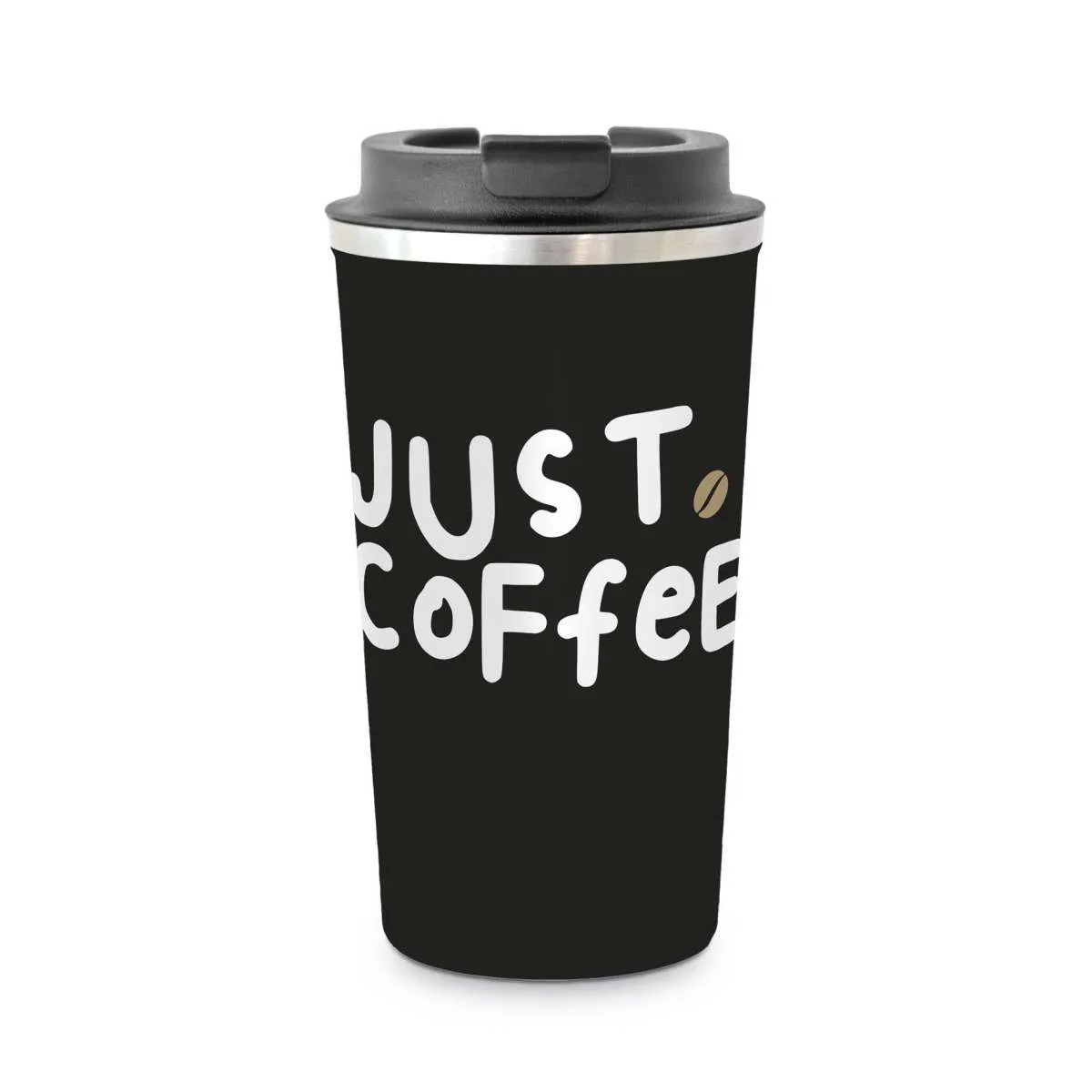 Was diesen Thermobecher so besonders macht, ist sein zeitloses Design: Auf tiefschwarzem Hintergrund prangt der weiße Schriftzug „Just Coffee“, begleitet von einer kleinen, liebevoll gestalteten Kaffeebohne. Eine elegante, edelstahlfarbene Streife unter dem Deckel rundet das stilvolle Erscheinungsbild ab. Modern, schlicht und dabei absolut hochwertig – ein echter Blickfang mit Charakter.