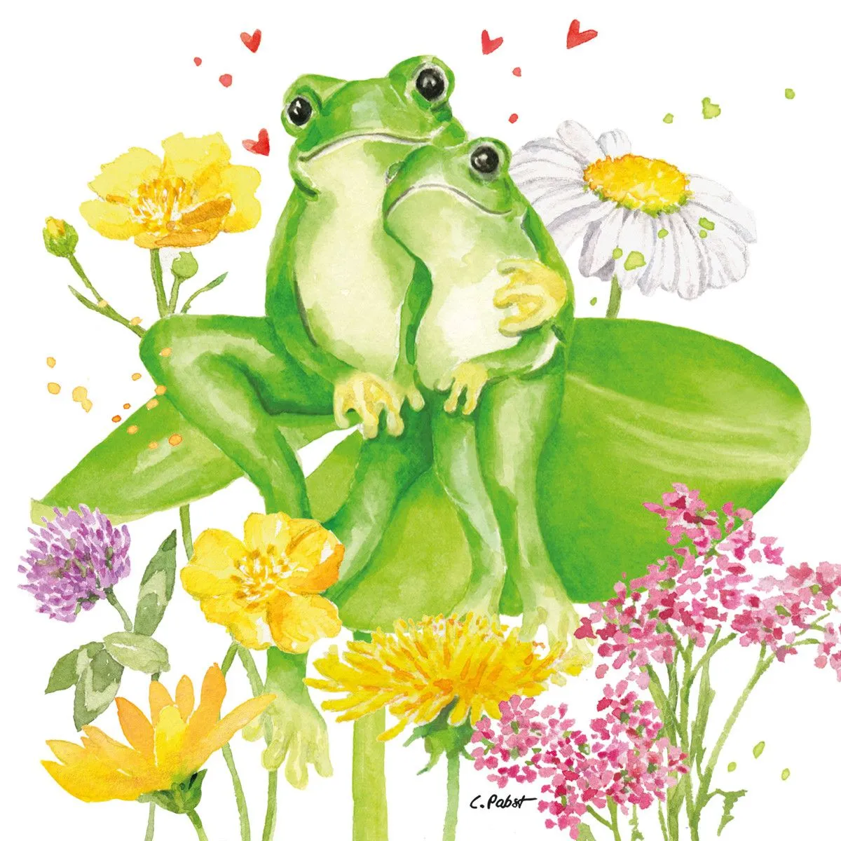 Wenn kleine Details große Gefühle wecken, dann sind es die ppd Servietten “Tina & Tom”, die Ihre Tischdekoration in eine liebevolle Botschaft verwandeln. Auf 33 x 33 cm entfaltet sich ein romantisches Motiv: Zwei verliebte Frösche, Tina und Tom, schmiegen sich innig aneinander – eingebettet in eine farbenfrohe, lebendige Blütenwelt auf einem satten grünen Blatt. Dieses Bild berührt das Herz und erzählt ganz ohne Worte von Nähe, Liebe und Verbundenheit.