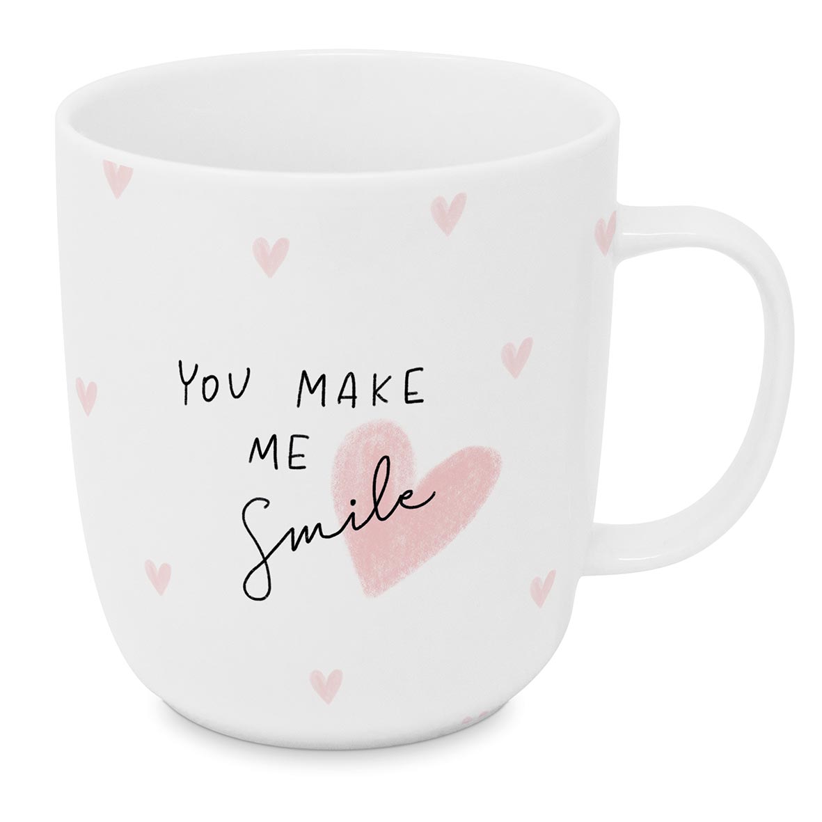 Die Dimensionen dieses Bechers sind mit einem Durchmesser von 8 Zentimetern so gestaltet, dass er bequem in der Hand liegt und sich mühelos in jede handelsübliche Tassenhalterung einfügt. Seine weiße Grundfarbe wird durch ein verspieltes Muster aus rosa Herzen ergänzt, die dem Becher eine liebevolle und fröhliche Note verleihen. Das Highlight bildet der inspirierende Spruch “You make me smile” der talentierten Designerin Izabella Markiewicz, der nicht nur ein Lächeln auf Ihr Gesicht zaubert, sondern auch Ihren Tag erhellt.
