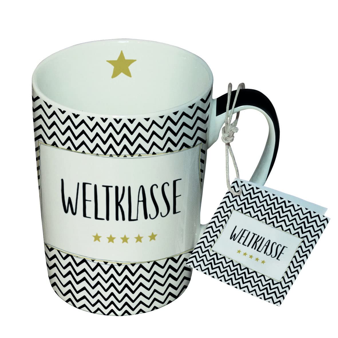 Das herausragende Merkmal dieser Tasse ist zweifellos ihr Design. Feine, schwarze Linien in einem markanten, gezackten Muster auf einem reinweißen Hintergrund verleihen der Tasse eine zeitlose Eleganz. Das zentrale Element des Designs ist das inspirierende Wort “Weltklasse”, das in auffälligen Buchstaben hervorsticht. Egal ob im Büro, zu Hause oder in Ihrem Lieblingscafé. Diese Tasse wird sicherlich bewundernde Blicke auf sich ziehen.
