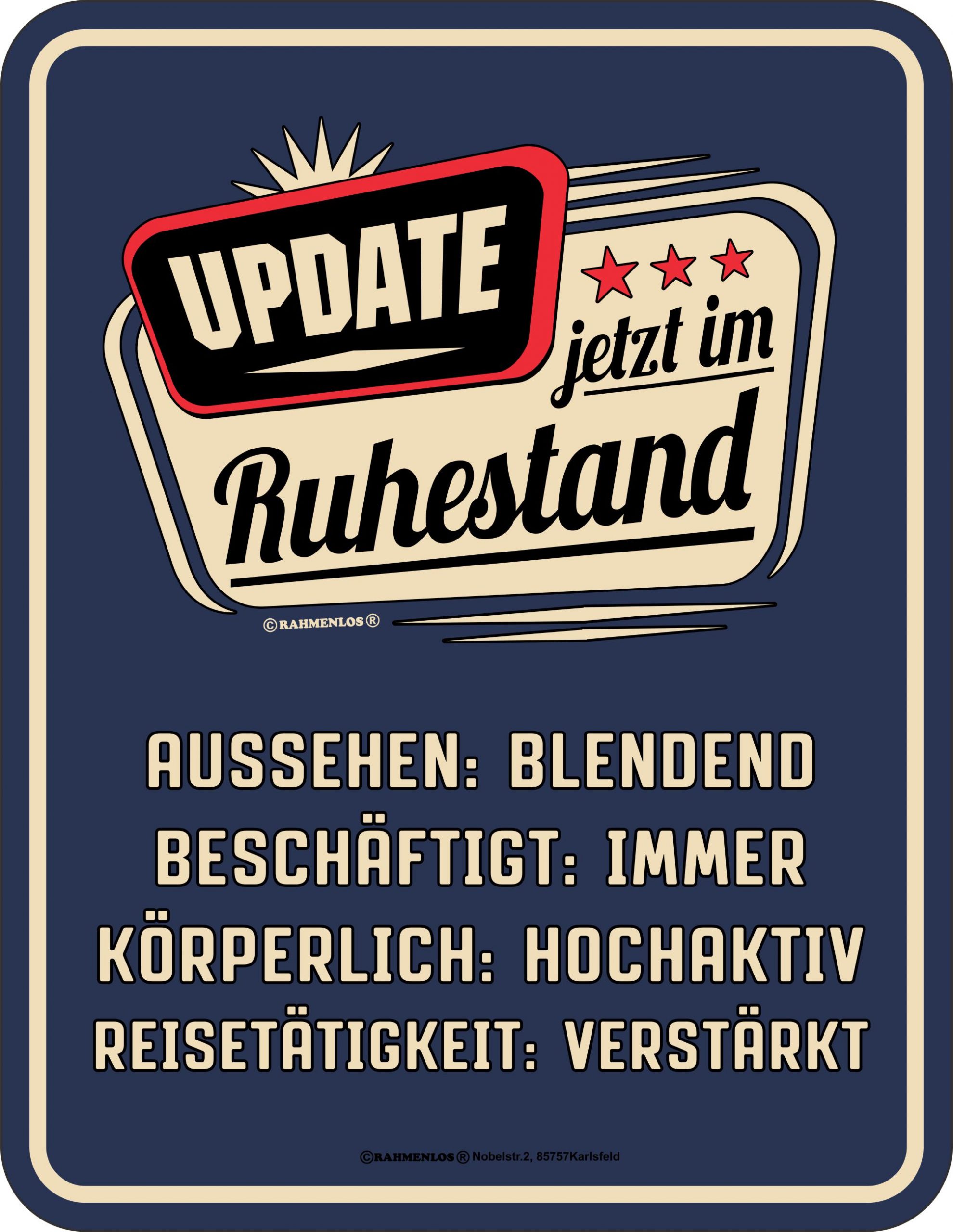 RAHMENLOS® Blechschild “Update – Ruhestand” – Ein humorvolles Geschenk für den neuen Lebensabschnitt