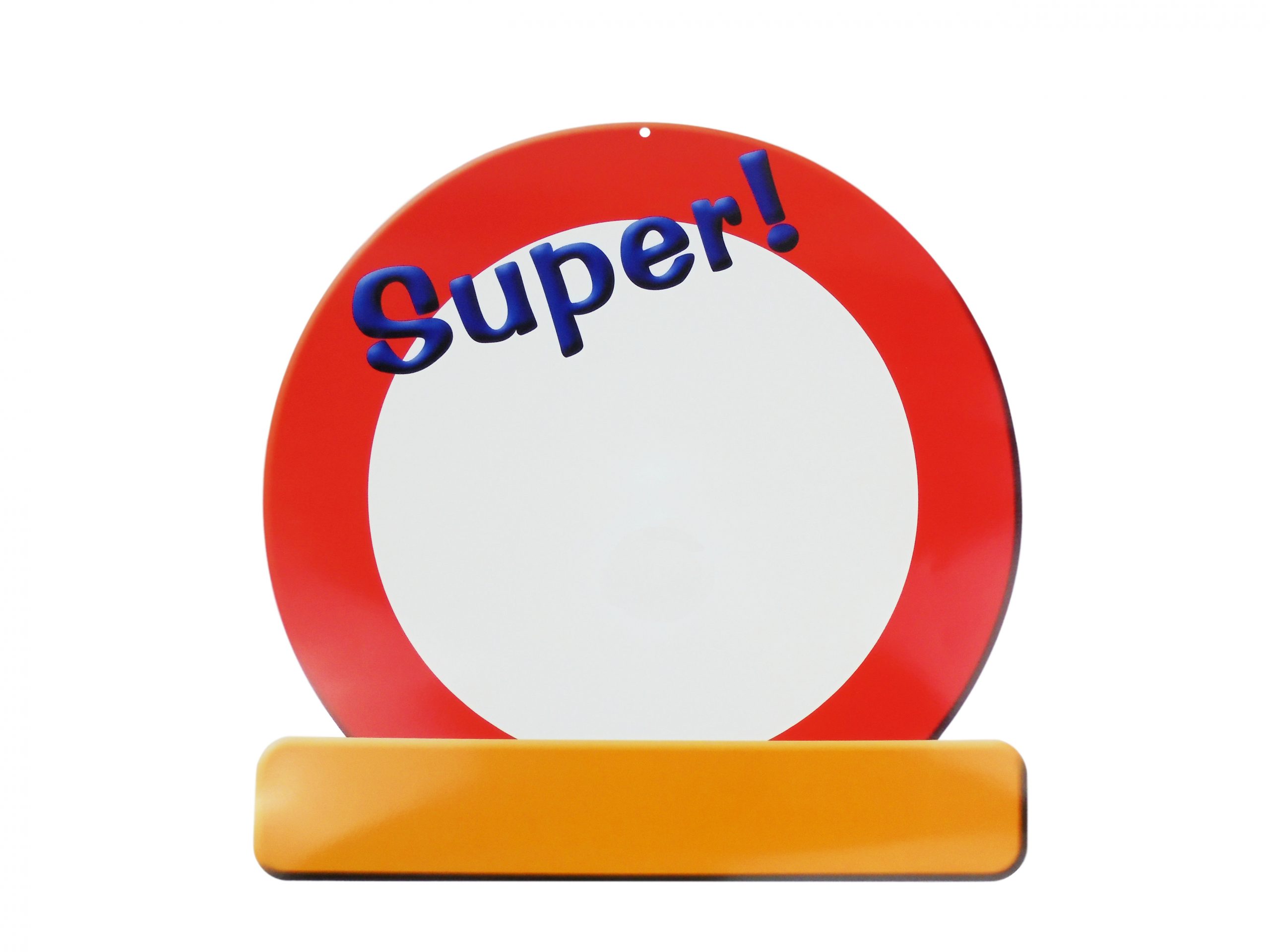 Die Form und die Aufmachung dieses Schildes, welches wie ein Verkehrszeichen aussieht, wird sofort gesehen. Dazu noch die Aufschrift: “Super!”. Vervollständige selbst den Text, indem du das weiße Feld selbst beschriftest. Notiere hier z.B. die Anzahl der Lebensjahre oder verfasse einen schönen Text.