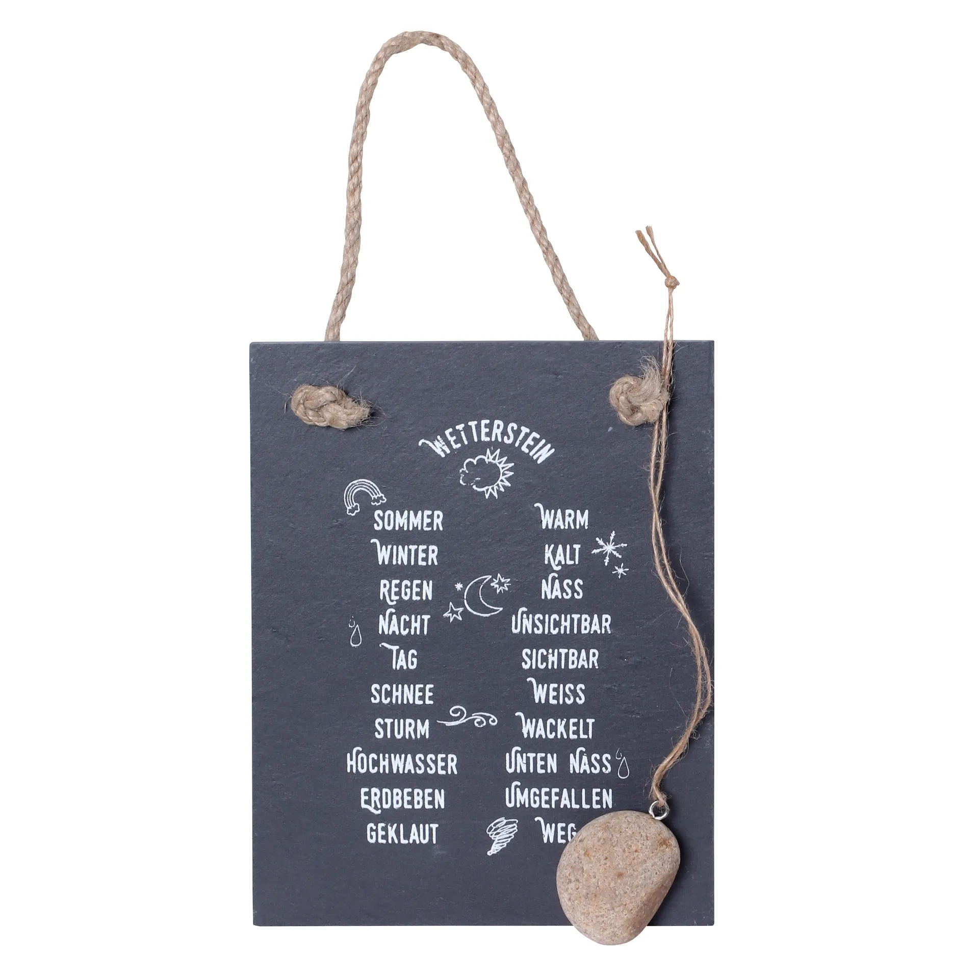 Dank des robusten Juteband-Aufhängers lässt sich die Schiefertafel mühelos an Türen, Wänden oder Zäunen befestigen. Sie ist wetterfest und eignet sich ideal für den Einsatz im Freien, behält aber auch drinnen ihren besonderen Charakter. Egal, wo Sie sie platzieren, der Wetterstein wird zum Blickfang und sorgt immer wieder für ein Schmunzeln bei Ihren Gästen.