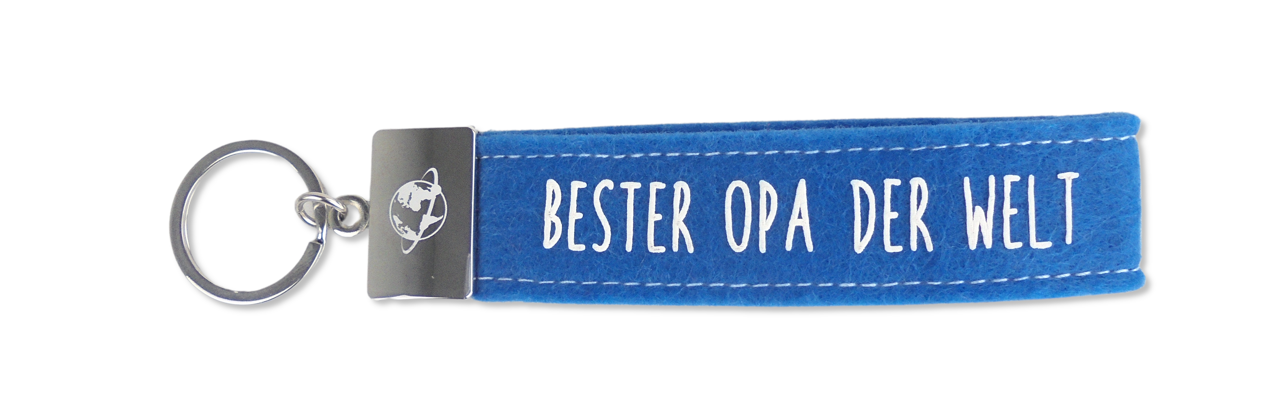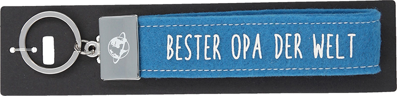 Dieser kultig bedruckte Schlüsselanhänger besteht aus einer Filzschlaufe, mit Sticknaht und einem Metallabschluss. Das Schlüsselband ist mit einem coolen, lustigem oder liebevollen Spruch auf der Vorderseite bedruckt. In diesem Fall ist das Filzband in der Farbe Blau, mit der Aufschrift “Bester Opa der Welt”. Auf dem Metallabschluss ist außerdem passend dazu die “Welt” gedruckt.